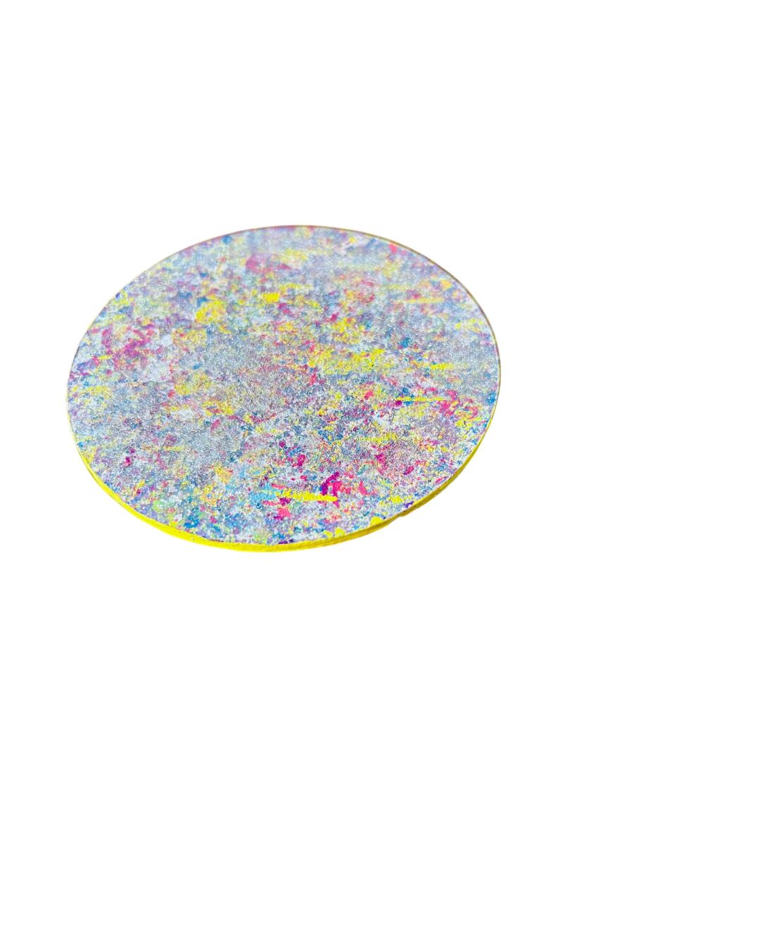 直径10cmのアクリル板に、アクリル絵の具で描きました。ラメが施されていて、見る角度によって色んな表情を見せてくれます。
