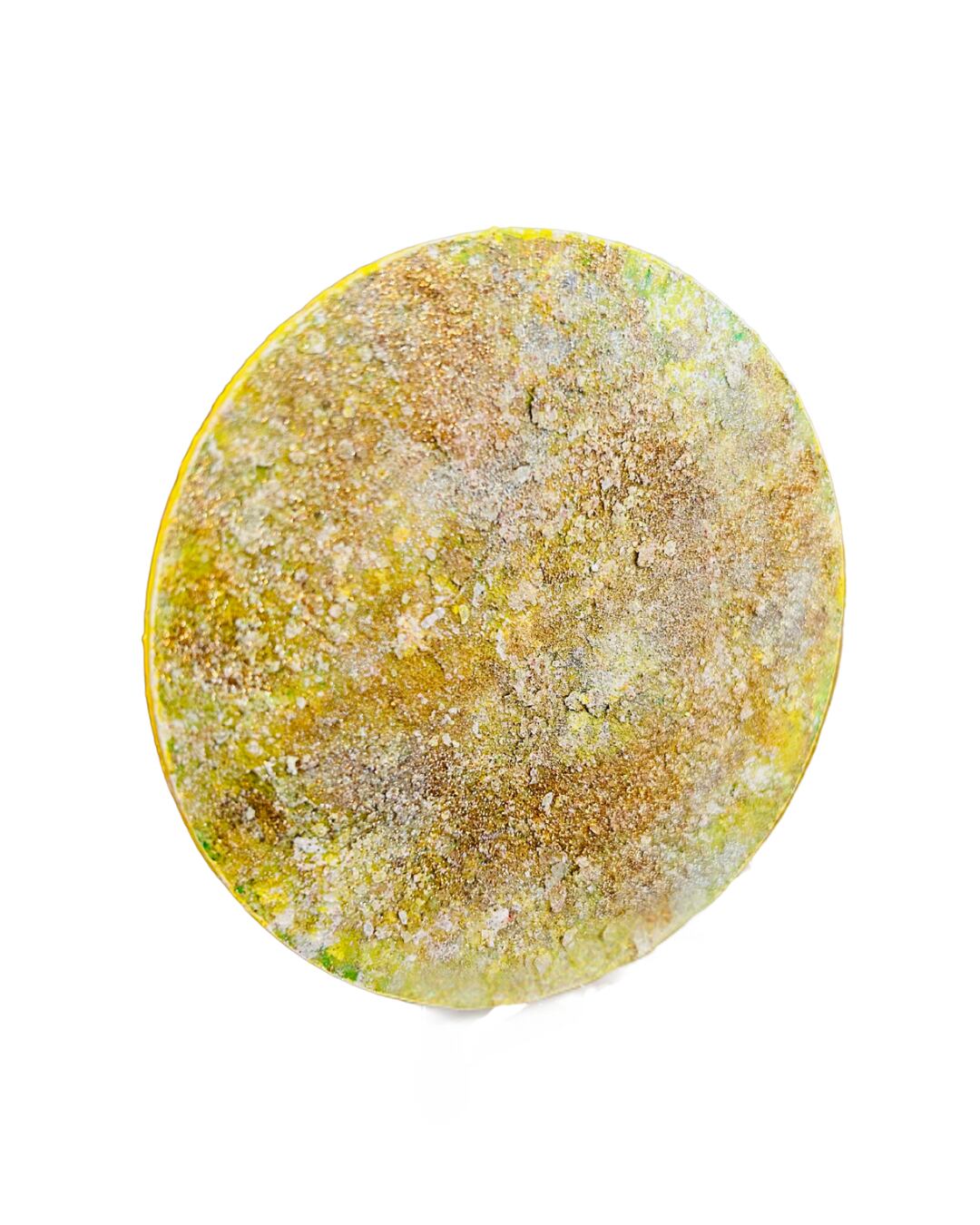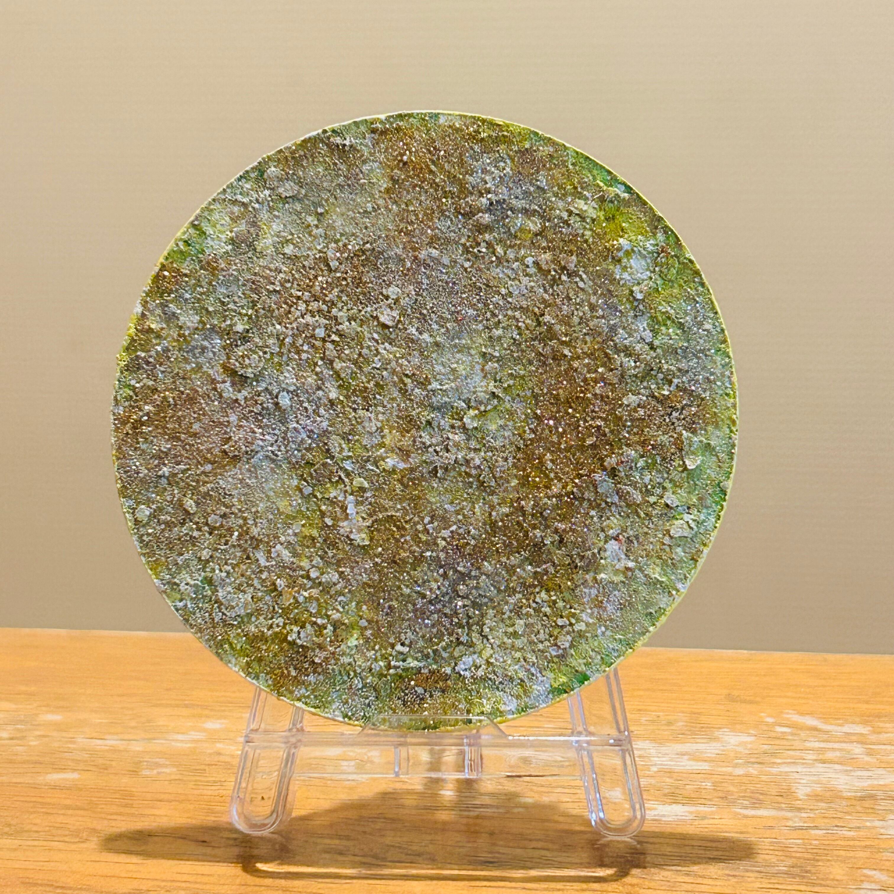 直径10cmのアクリル板に、アクリル絵の具で描きました。ラメが施されていて、見る角度によって色んな表情を見せてくれます。
