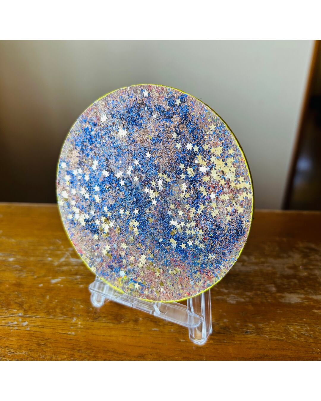 直径10cmのアクリル板に、アクリル絵の具で描きました。ラメが施されていて、見る角度によって色んな表情を見せてくれます。
