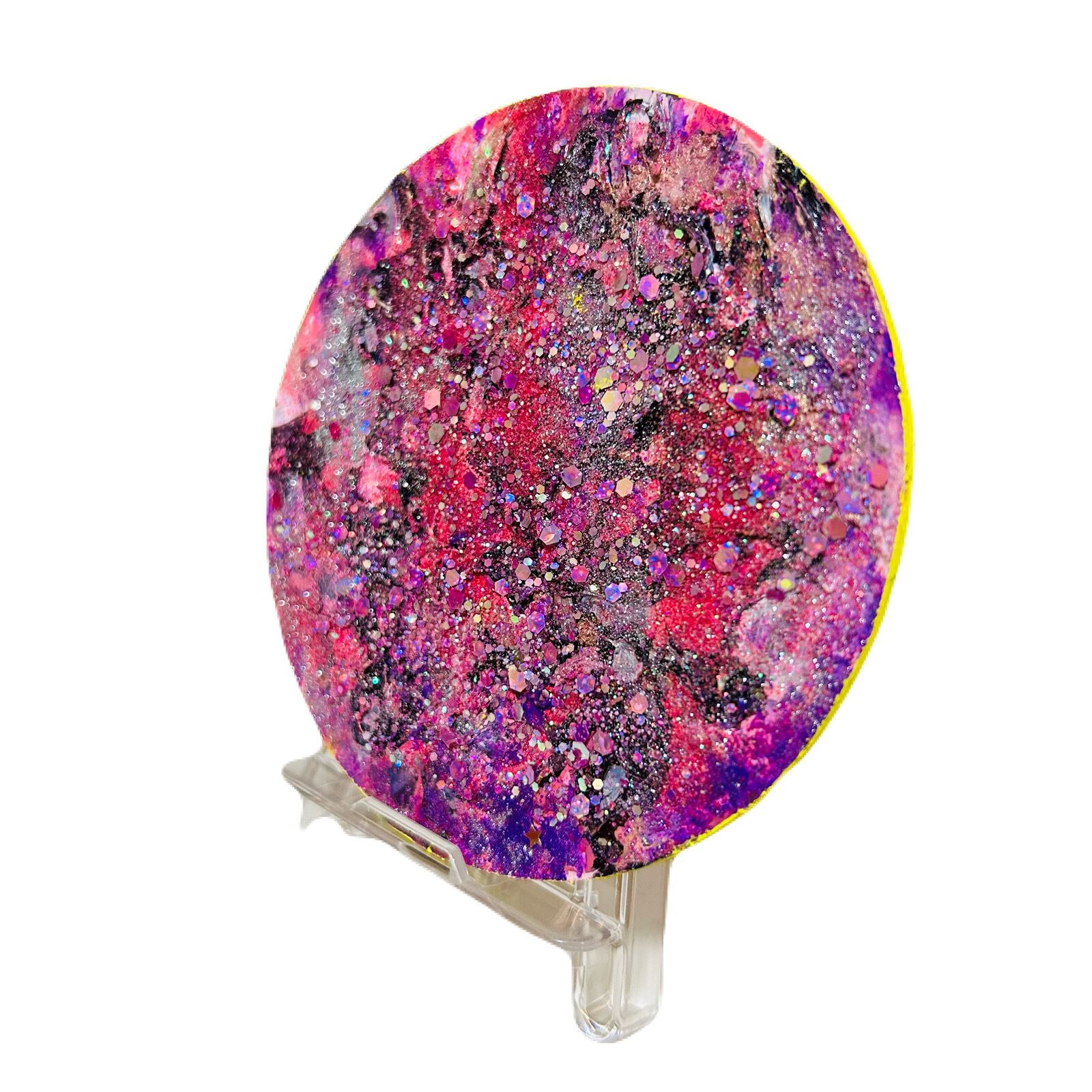 直径10cmのアクリル板に、アクリル絵の具で描きました。ラメが施されていて、見る角度によって色んな表情を見せてくれます。
